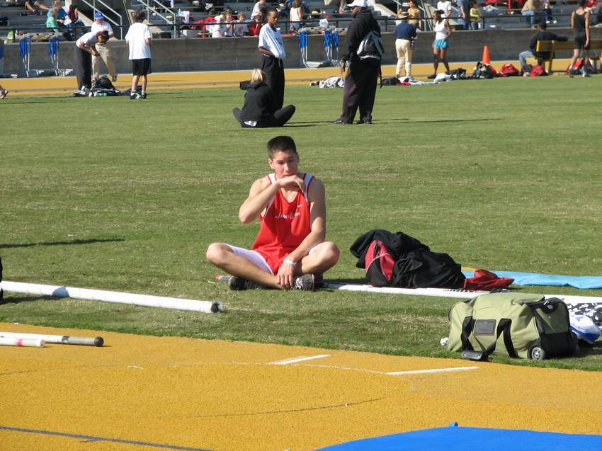 Anthony’s mid stride was off and not consistant during his runs. Slight breeze with cross and tail winds. He had help from the Granada High Coaches who stayed to assist with his vaults. It was just not his day!