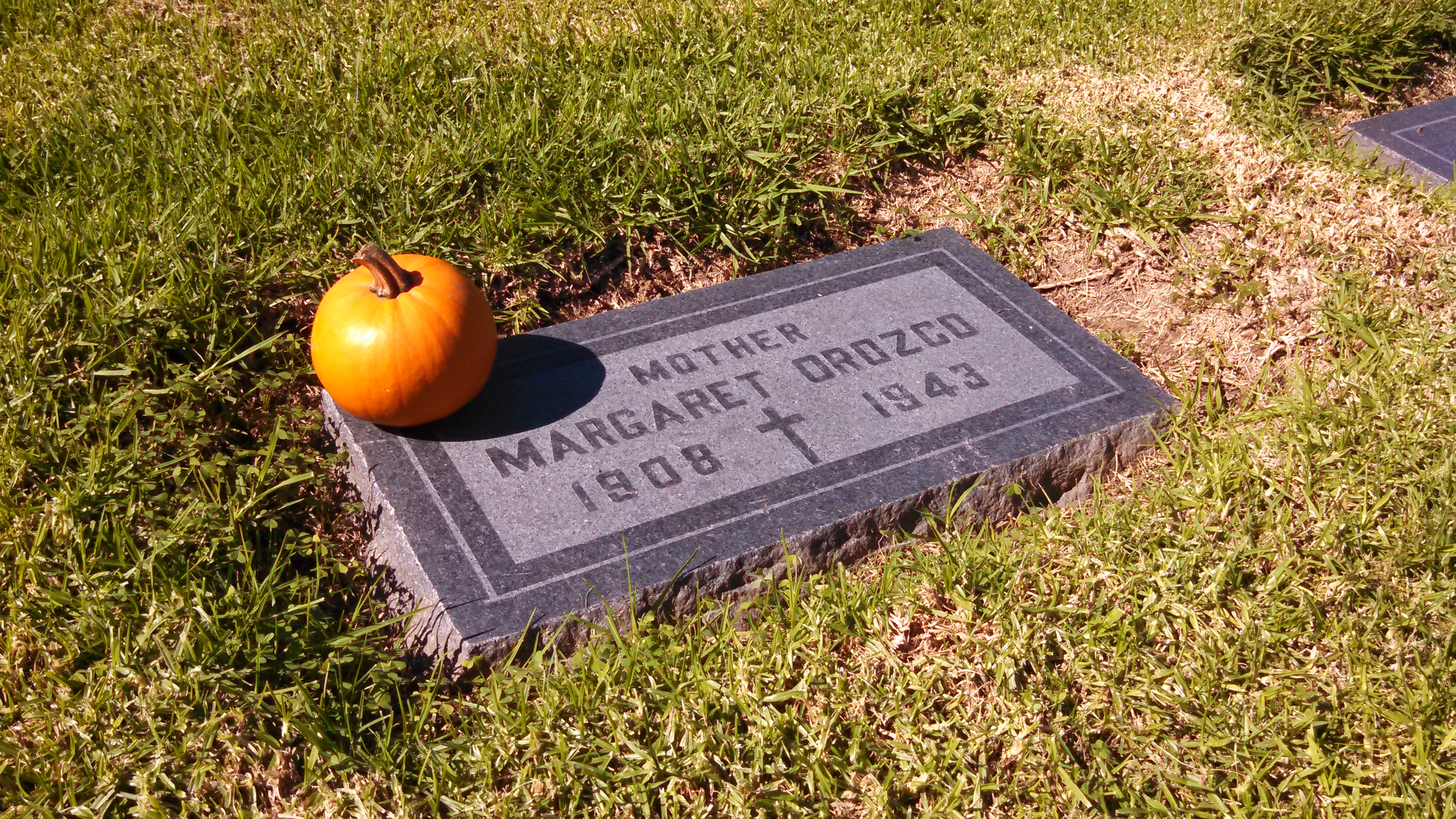 Today Jerry and I (Margaret) were coming home from San Diego, so we decided to visit grandma at the Carpentaria cemetery. We got a pumpkin to take to her since it is fall instead of flowers. I layed on the lawn next to her and just started chatting to her. I feel a closeness even though we have never met. I am so grateful for all the family we have because of her. As we walked to the car, a Monarch butterfly actually follows me as I get in the car and is hovering by the window…it seemed to follow us…I suddenly got a chill… I have heard that butterflies represent the soul of the decreased… Grandma?